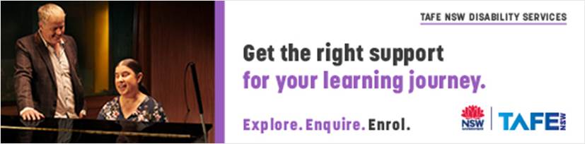 [TAFE NSW Disability Services. Get the right support for your learning journey. Explore. Enquire. Enrol. Image of Jennifer, a blind music student, playing piano in a music studio, with ther eacher watching on.]<https://na01.safelinks.protection.outlook.com/?url=https%3A%2F%2Fwww.tafensw.edu.au%2Fstudent-services%2Fdisability-services&data=05%7C01%7C%7Cbd9a833a8b1a4246722908db34a7cf42%7C84df9e7fe9f640afb435aaaaaaaaaaaa%7C1%7C0%7C638161667589108151%7CUnknown%7CTWFpbGZsb3d8eyJWIjoiMC4wLjAwMDAiLCJQIjoiV2luMzIiLCJBTiI6Ik1haWwiLCJXVCI6Mn0%3D%7C3000%7C%7C%7C&sdata=OsosfjQ1Bp4ITNQnI%2FOErNgpLjZtF%2BzIkXN9itKQYlw%3D&reserved=0>