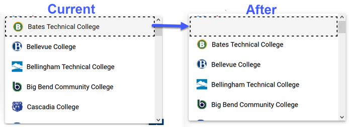 [Image displaying the current institution dropdown menu on the left with Bates Technical College first, and an updated dropdown on the right with a blank space firs.]