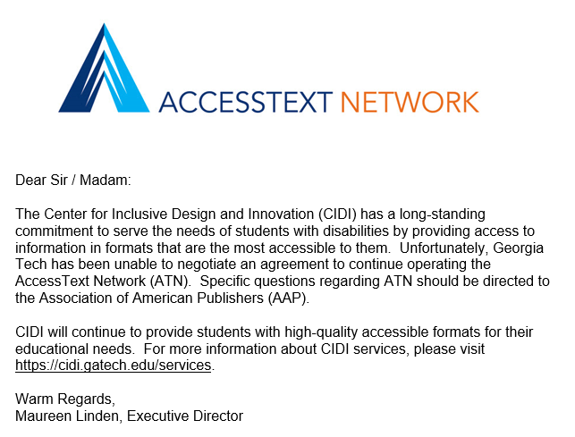 I just received this email. Have any of you heard anything related to this? I haven't worked in higher ed disability resources long enough to remember a time before AccessText existed. I'm not looking forward to alternate format work without it.