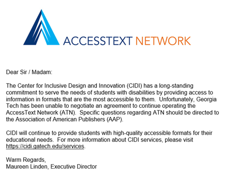 The Center for Inclusive Design and Innovation (CIDI) has a long-standing commitment to serve the needs of students with disabilities by providing access to information in formats that are the most accessible to them. Unfortunately, Georgia Tech has been unable to negotiate an agreement to continue operating the AccessText Network (ATN). Specific questions regarding ATN should be directed to the Association of American Publishers (AAP).