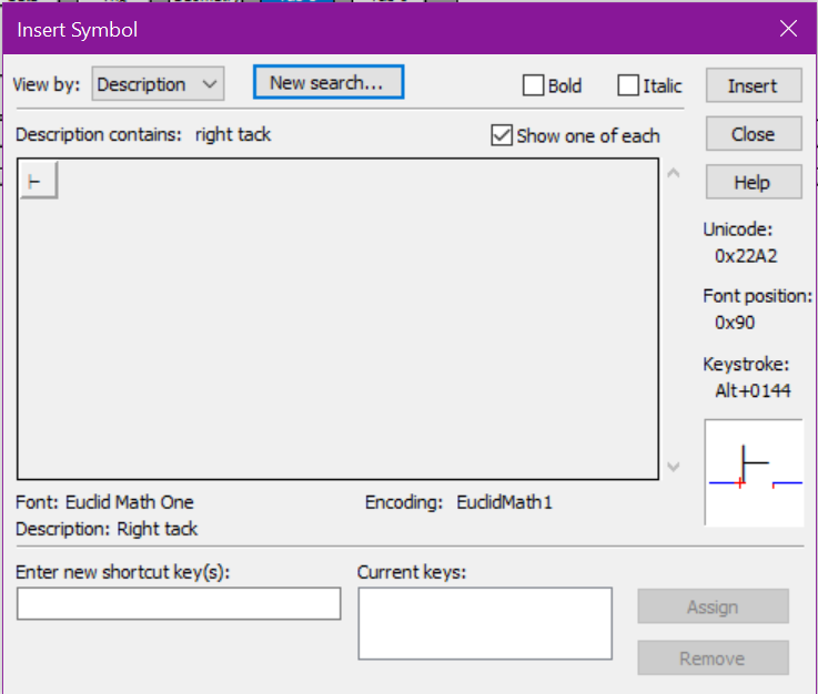 I’m struggling to find a symbol. Have done all the appropriate searching, and no luck. I am working on a computer science/algorithms book. The symbol is the right tack, and it shows up a LOT and I need to find out how to place it in mathtype. It looks like this: